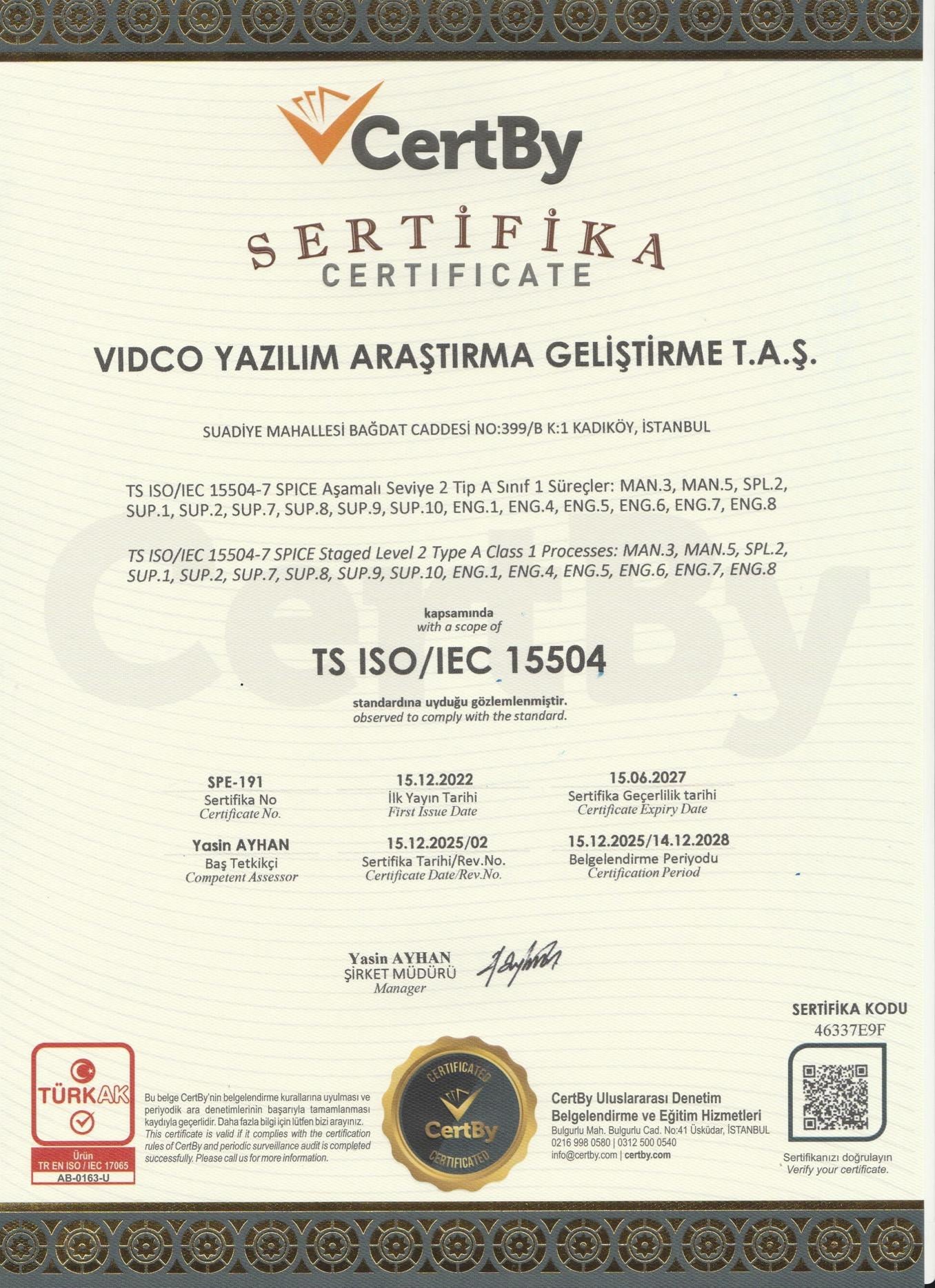 Sürekli gelişim felsefesi ile ISO 9001 Kalite Yönetim Sistemi Sertifikası ve ISO 27001 Bilgi Güvenliği Sertifikası , ISO 15504 SPICE II Yazılım Süreçleri Değerlendirilmesi ve Organizasyonel Olgunluk sertifikası, Kamu Bilişim Yetki Belgesi ve Kamu Yazılım Yetki Belgesi konusunda çalışmalarını tamamlamış ve bu sertifikaları almaya hak kazanmış firmamız uluslararası vizyon ile ülkemize katma değer sağlamak için çaba göstermeye devam etmektedir.